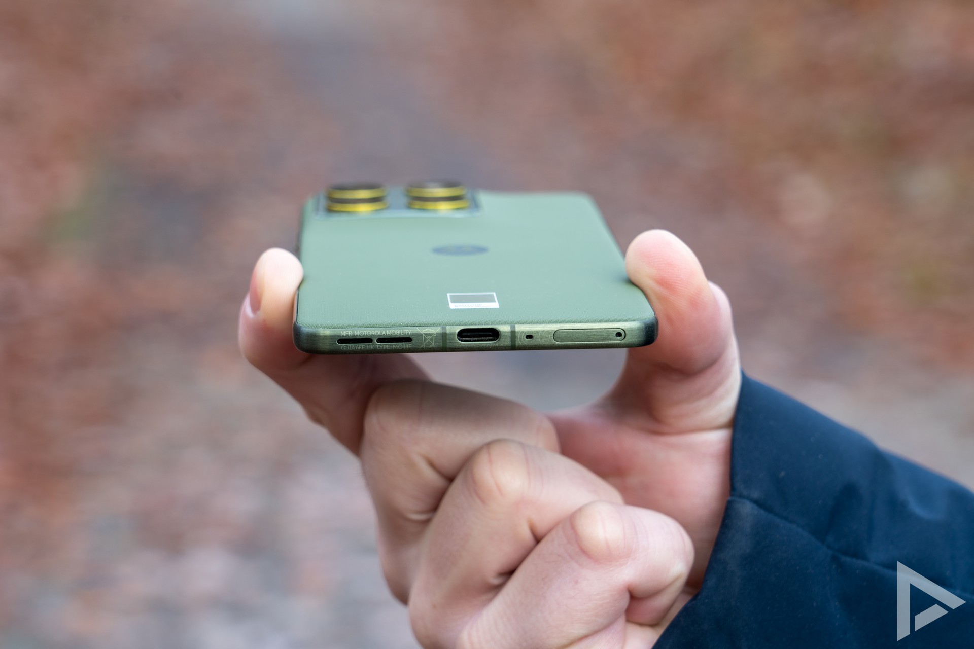 It's certainly not Motorola's first phone with a striking colour scheme, once again they collaborated with Pantone to arrive at the Edge 70's colours. Besides Bronze Green (olive green), there is also a slightly lighter green (with orange accents) and a dark grey variant (with blue accents) available. In daylight, this gives the phone a unique look.